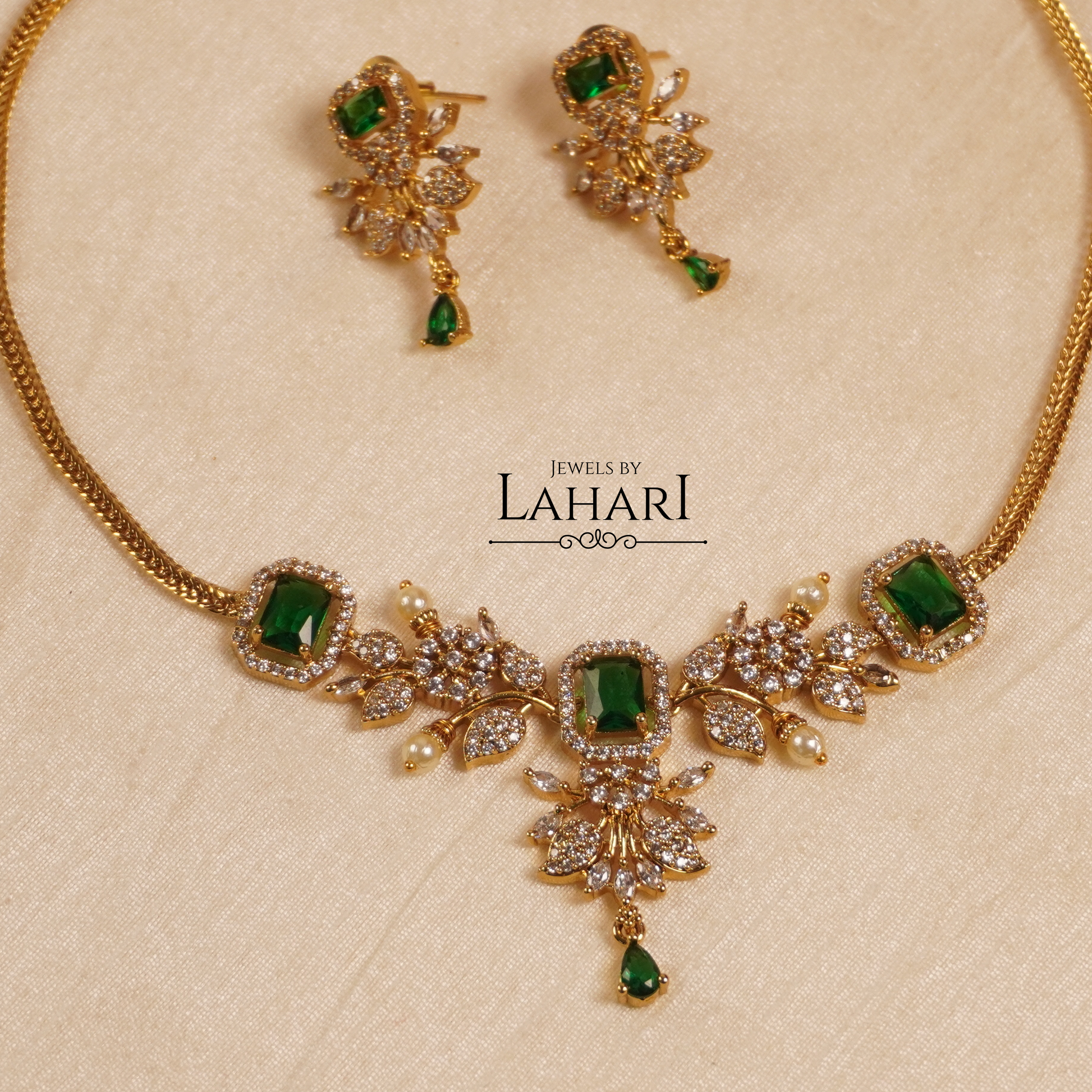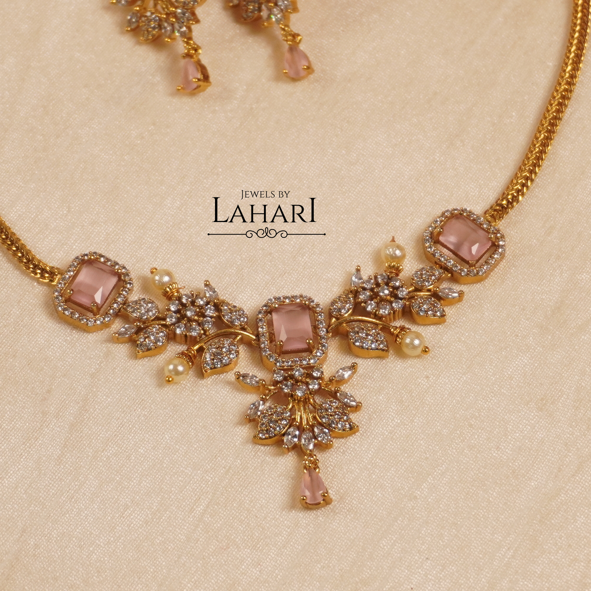 The Aaradhya Minimal Necklace Set is an elegant blend of modern sparkle and traditional grace. Adorned with dazzling CZ stones and center gemstones in vibrant hues— Green, Ruby, Pastel Pink, Pastel Green, Purple, Green & Ruby, Navy Blue, and White—this design is a timeless celebration of femininity. The necklace is paired with perfectly matched earrings, making it an easy pick for weddings, festivals, or intimate celebrations.