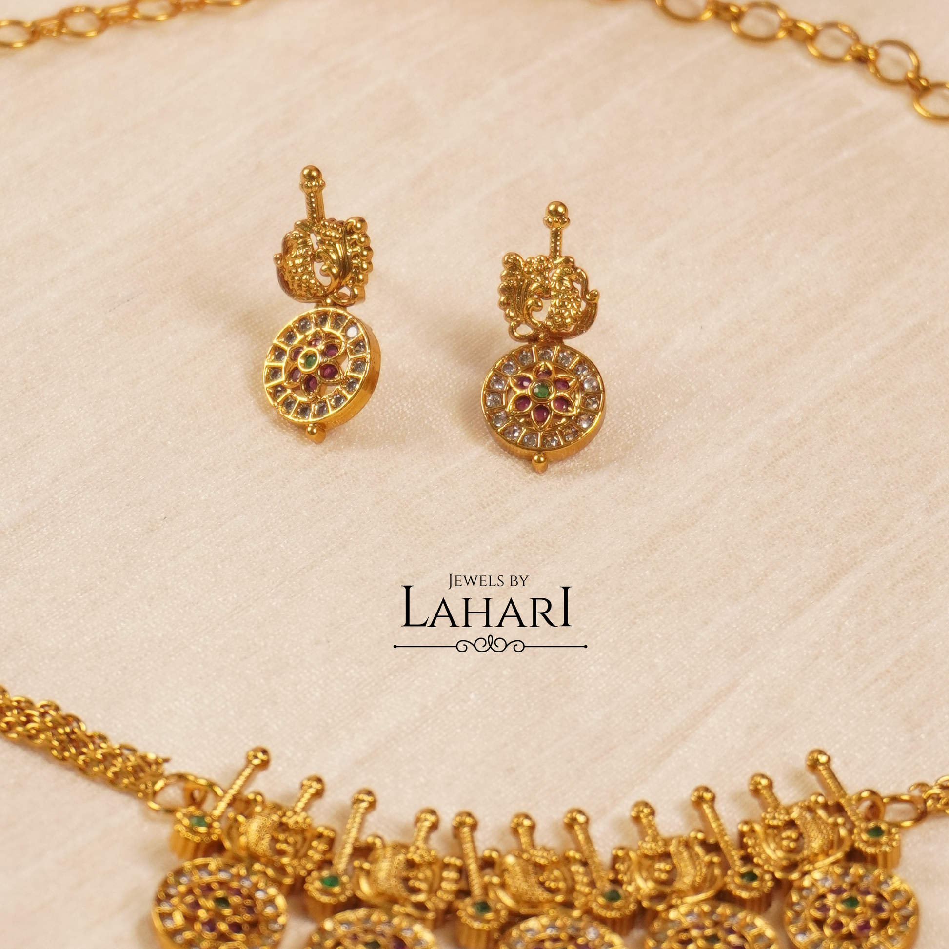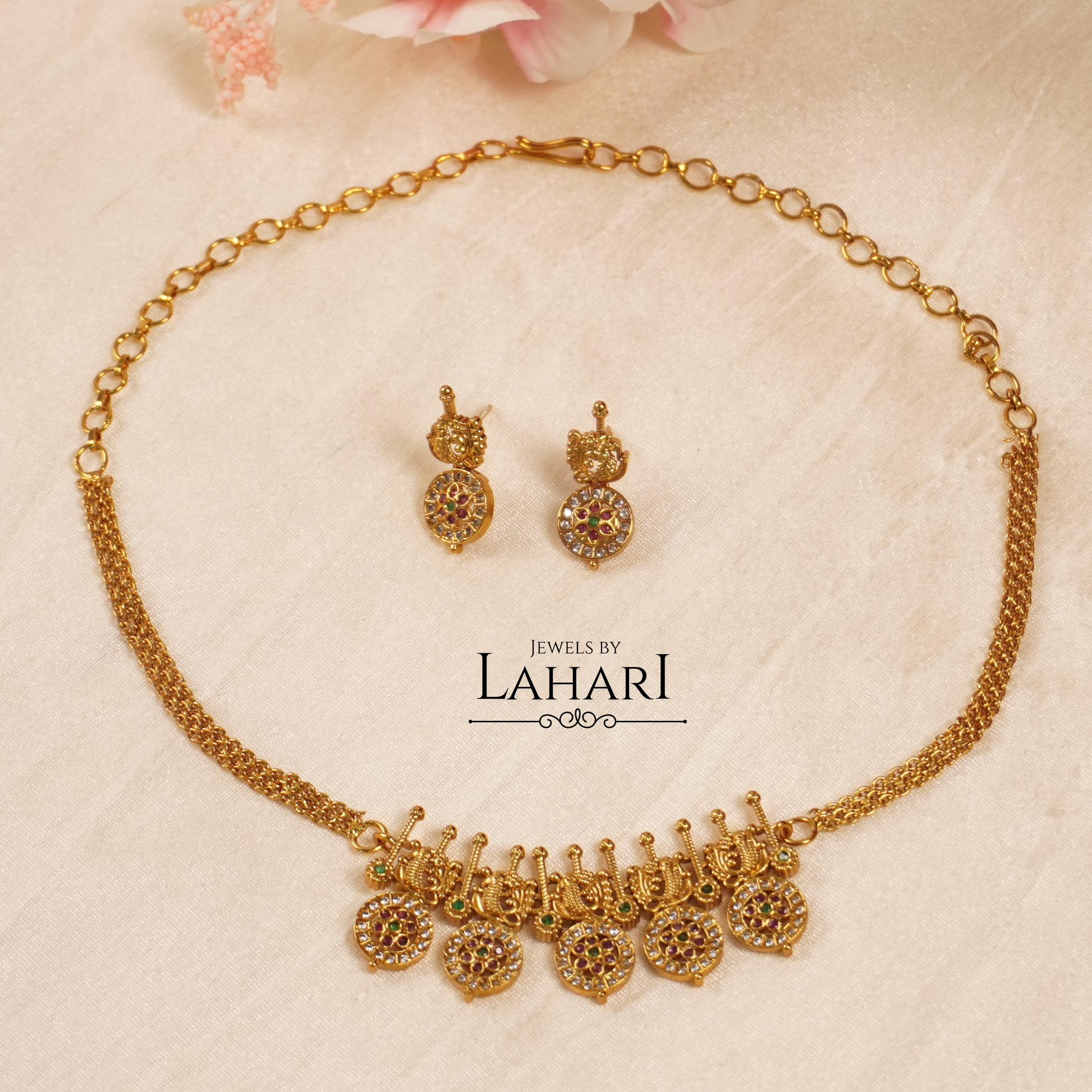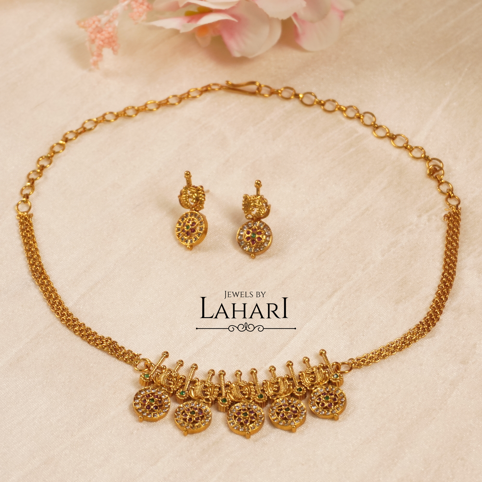 Graceful and rich in traditional charm, the Flower Coin Necklace Set features intricately designed coin-shaped motifs adorned with multicolored stones, all finished in a classic antique gold tone. The flower-like detailing in each pendant adds a soft, feminine touch to the overall bold structure. Paired with matching earrings, this set beautifully brings together heritage and elegance, making it perfect for any festive or celebratory occasion.