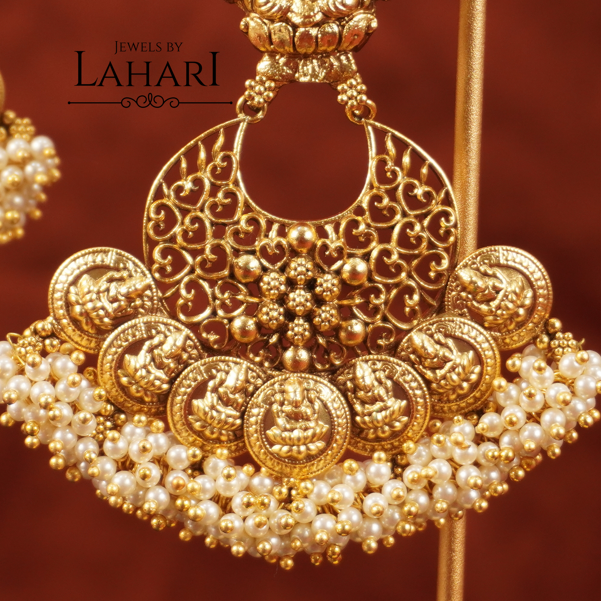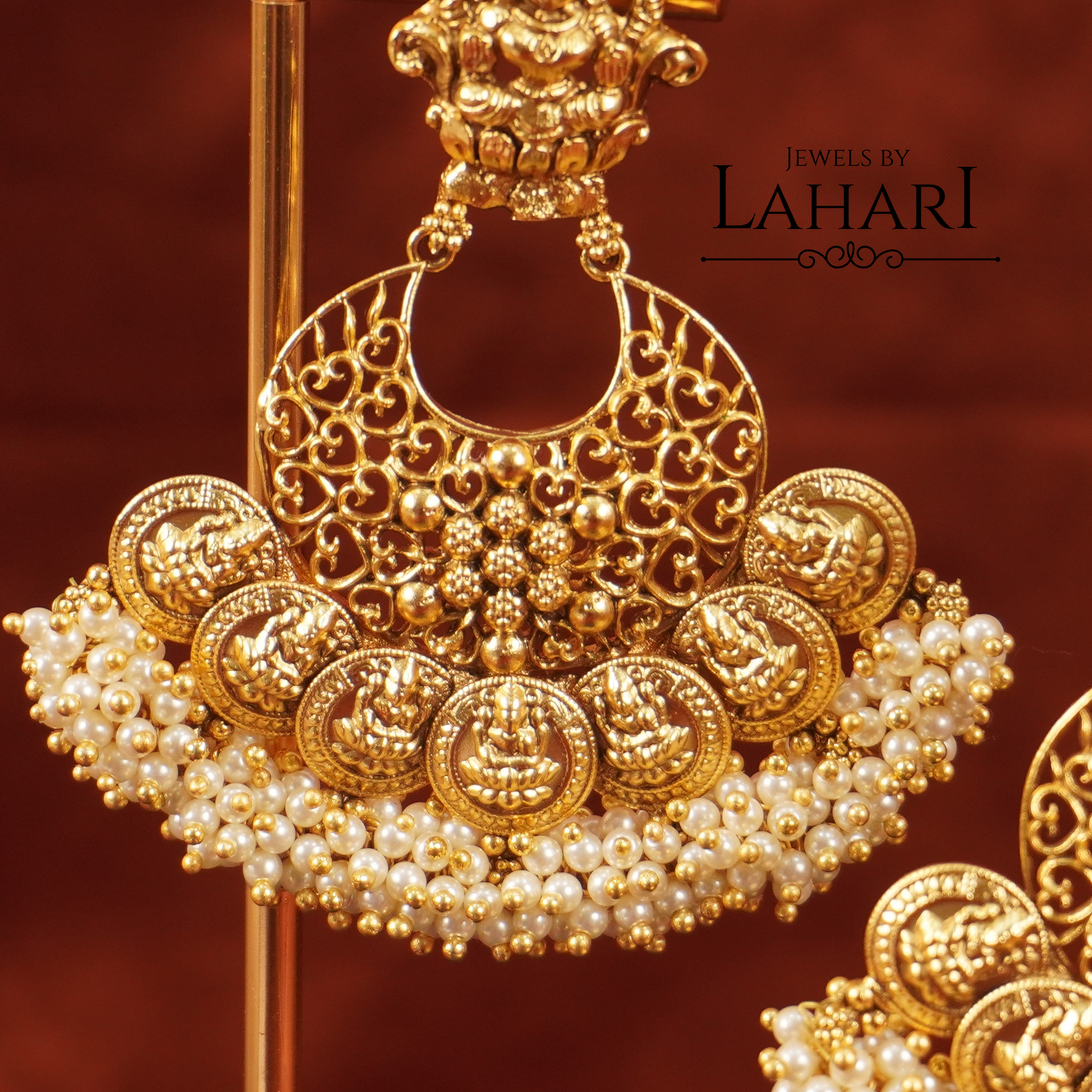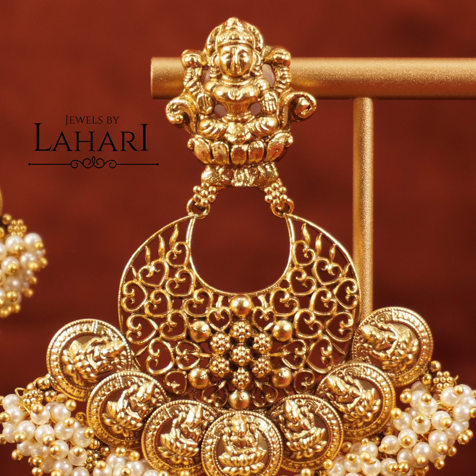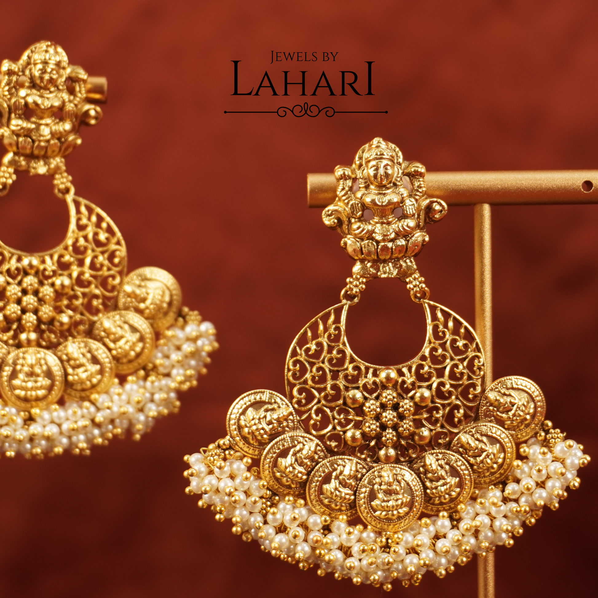 - These earrings can be worn alone for a bold, majestic statement or combined with a matching antique coin haram or Lakshmi kasu mala for a royal bridal look.