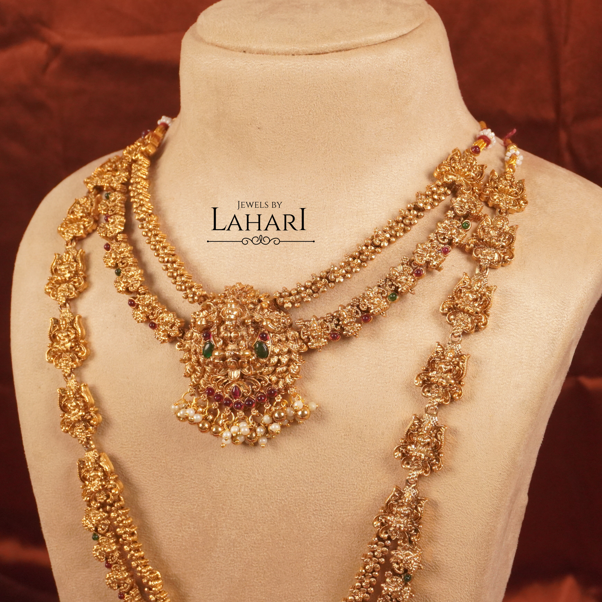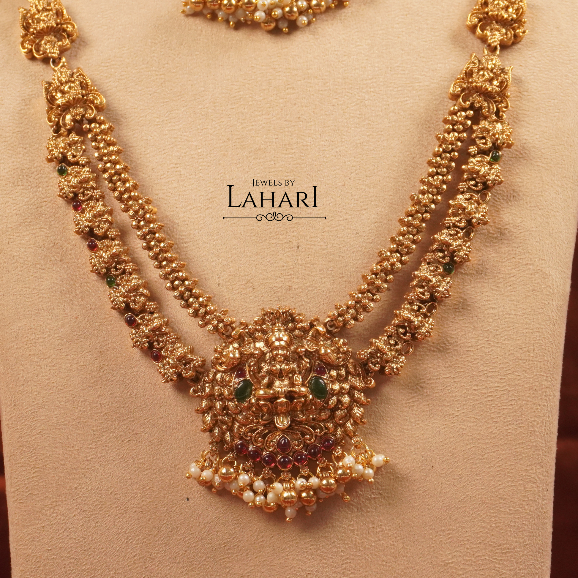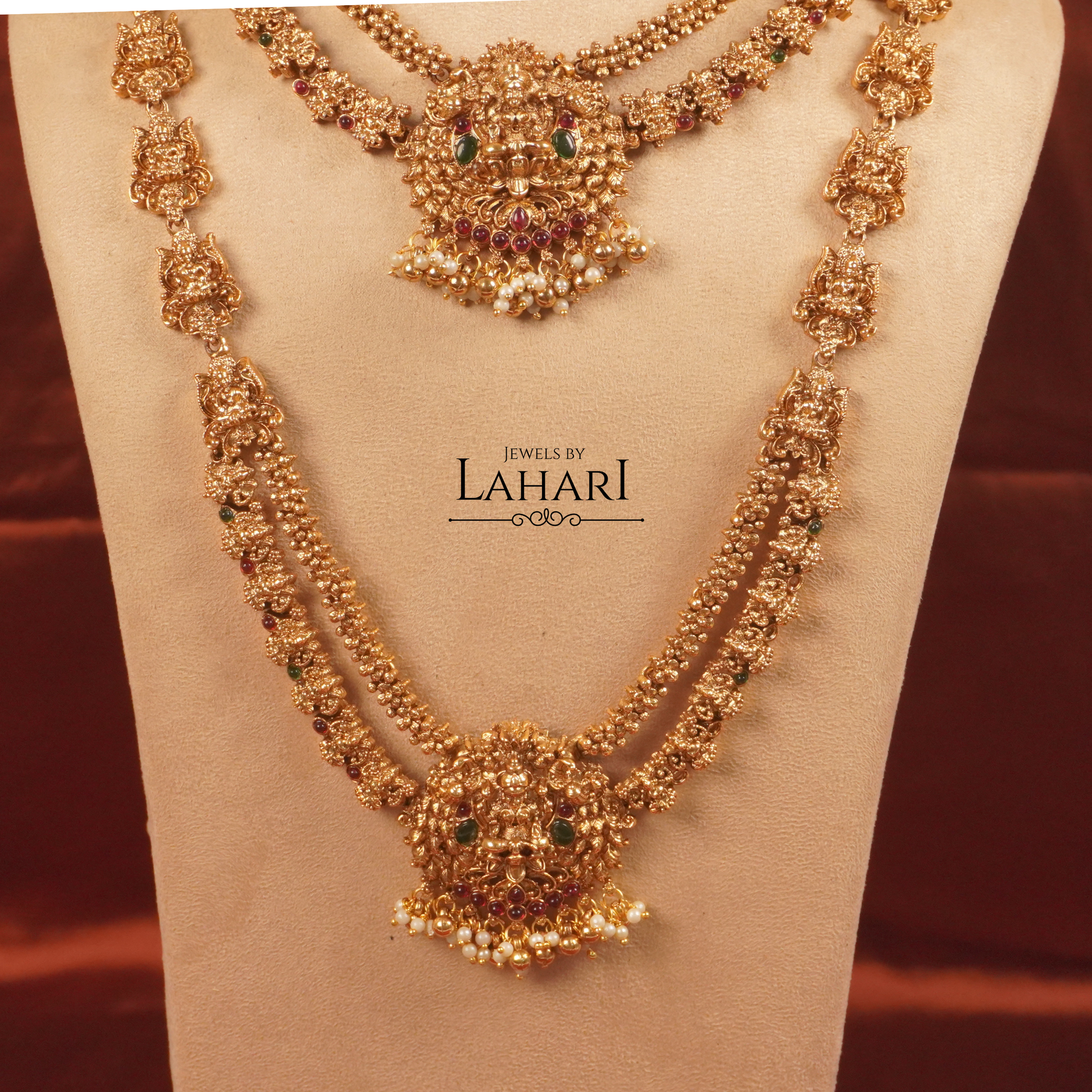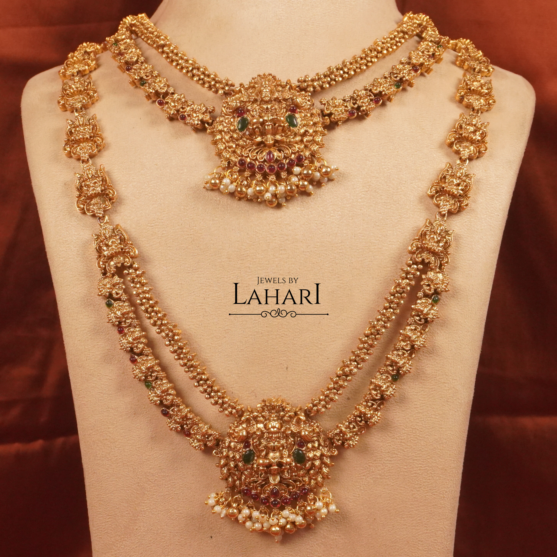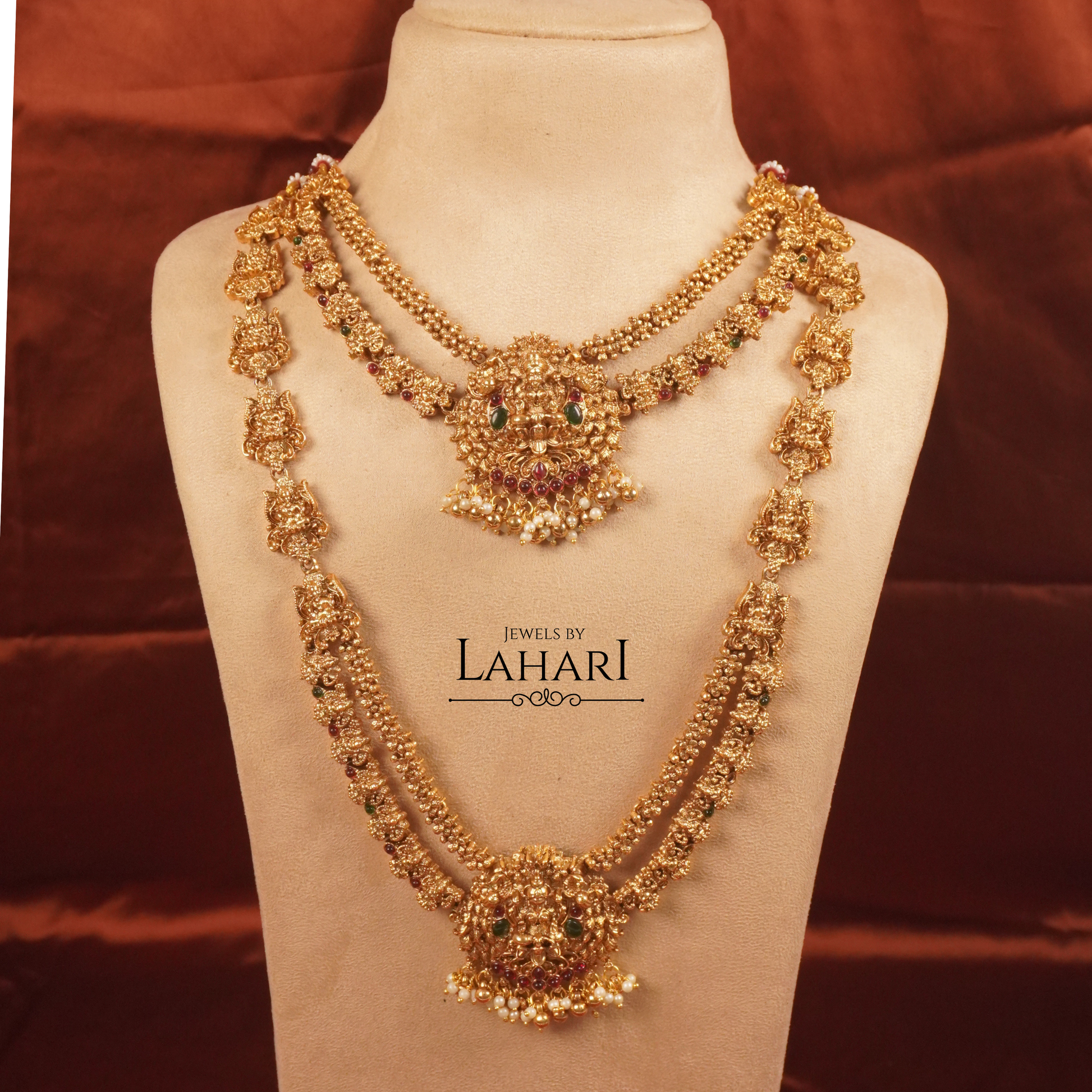 Celebrate timeless tradition with our Lakshmi Rajamala Combo Set, a grand ensemble crafted for elegance and grace. This exquisite set features a beautifully detailed Lakshmi choker paired with a long haram, both adorned with intricate temple-inspired carvings, subtle ruby-green accents, and delicate pearl drops.