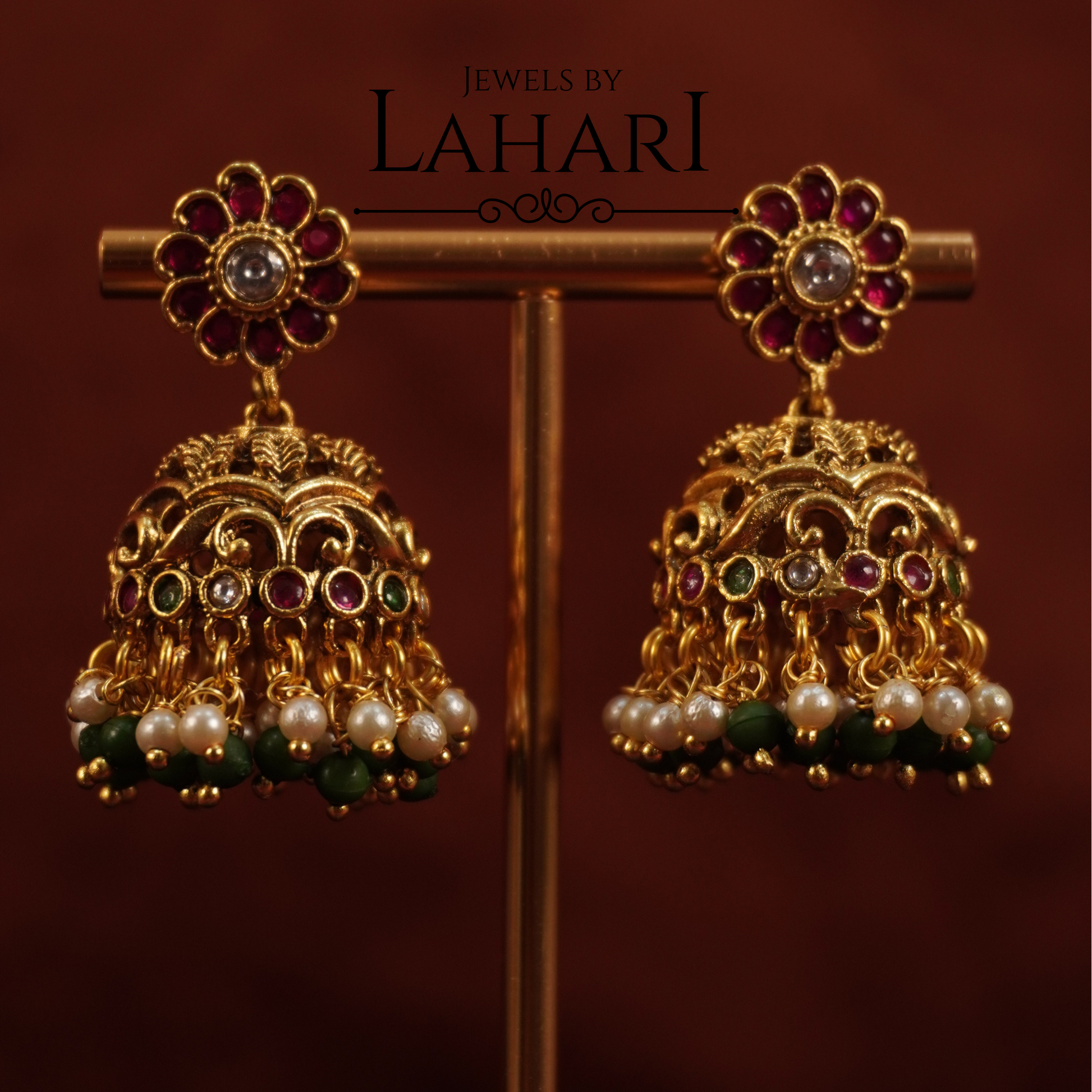 Step into timeless elegance with our Lakshmi Temple Necklace, a divine piece that beautifully blends heritage and artistry. Featuring intricate Goddess Lakshmi motifs, peacock accents, and a central moon pendant, this necklace is adorned with floral patterns, ruby-toned stones, green beads, and classic pearl drops. Paired with coordinating Floral Jhumkas, this set captures the richness of South Indian traditions and is a true statement for festive and bridal occasions.