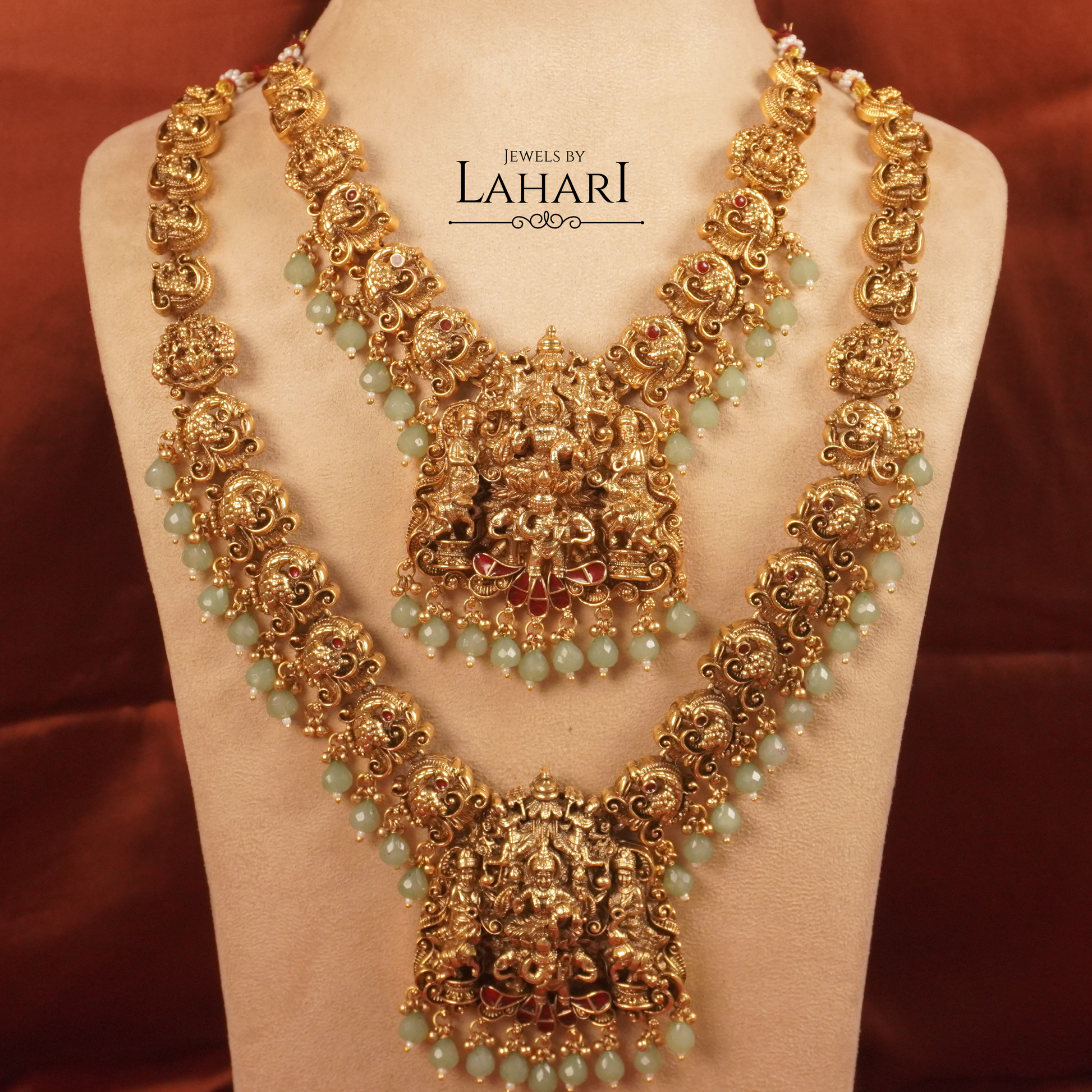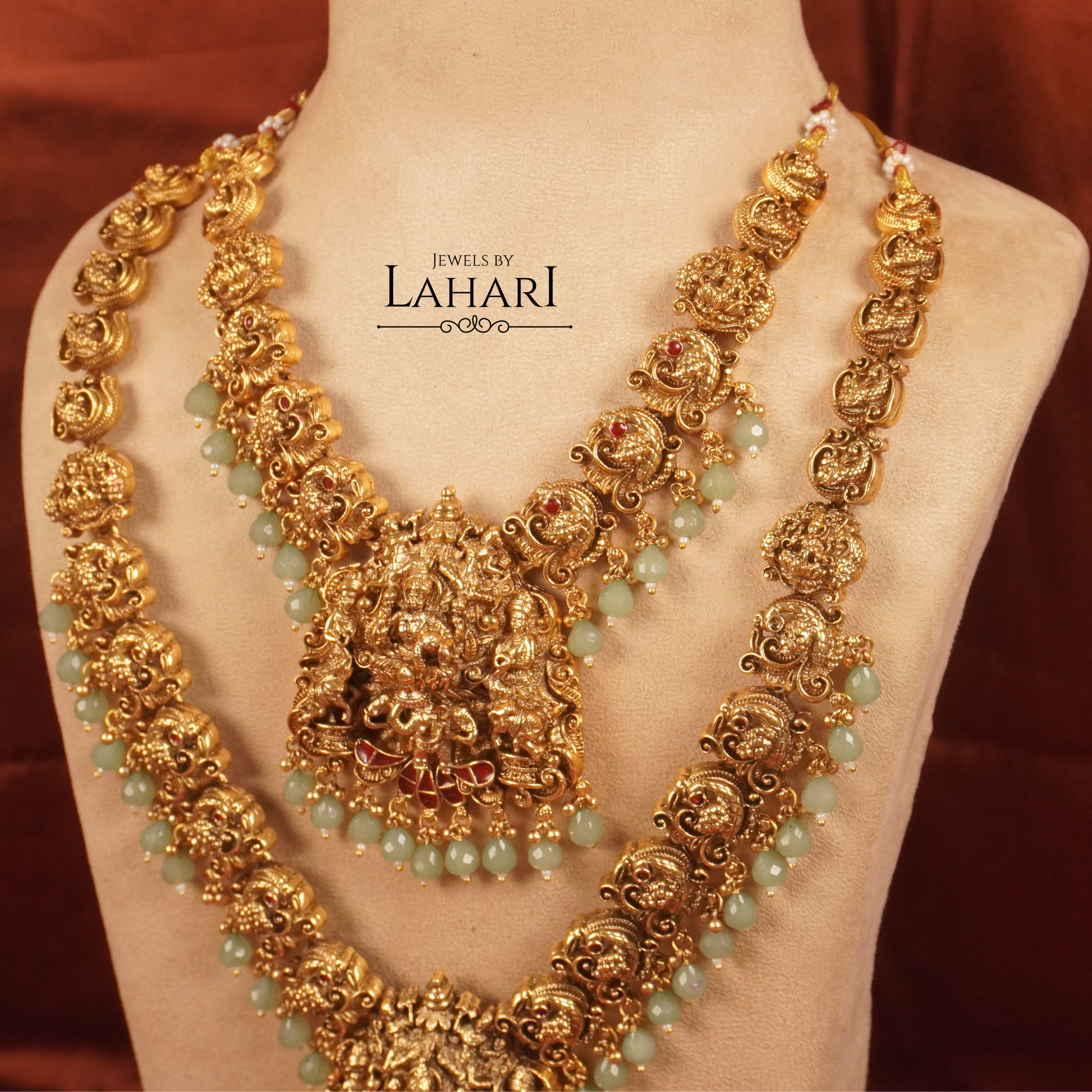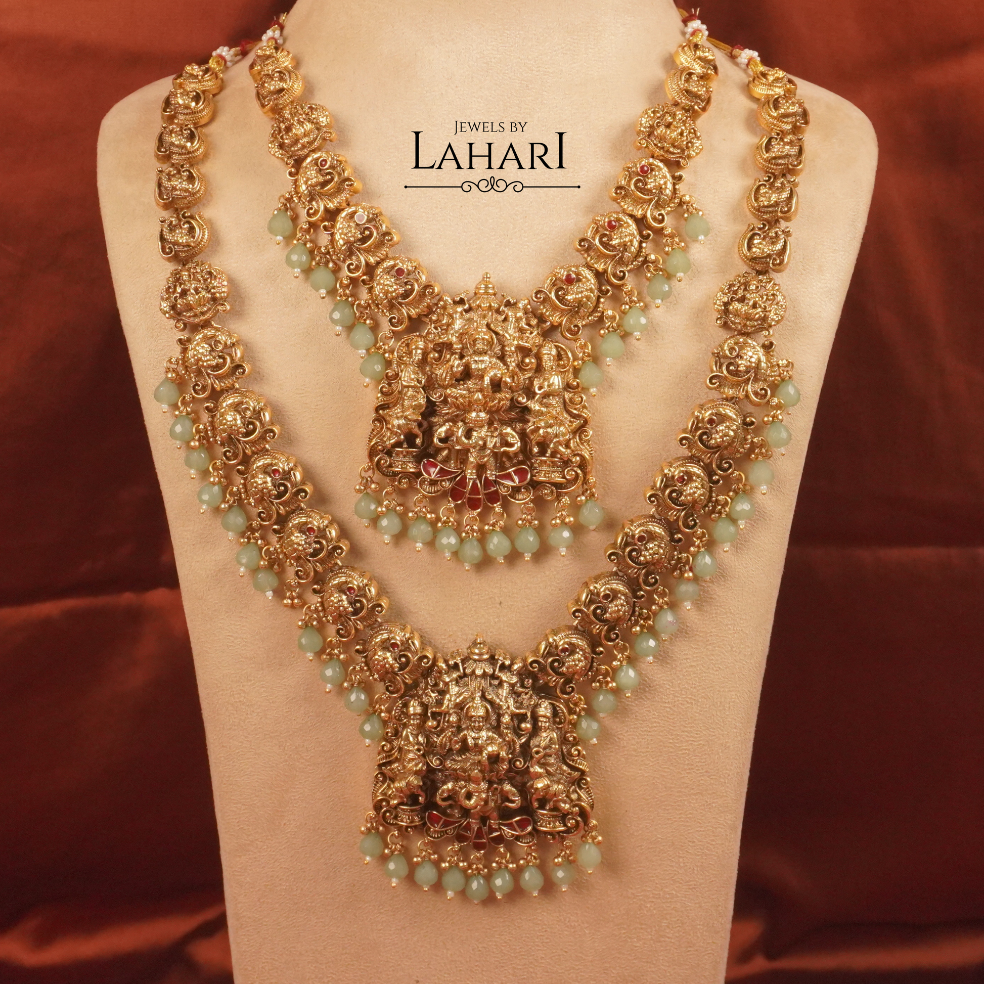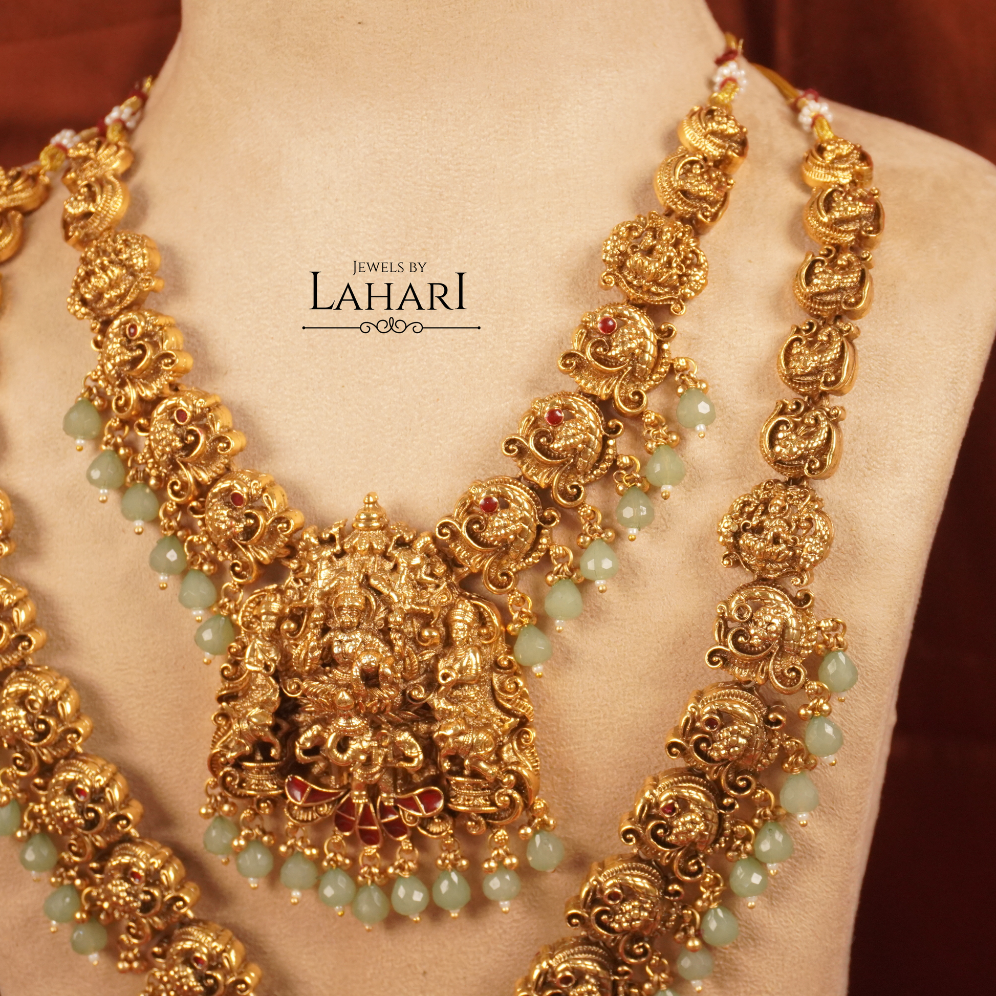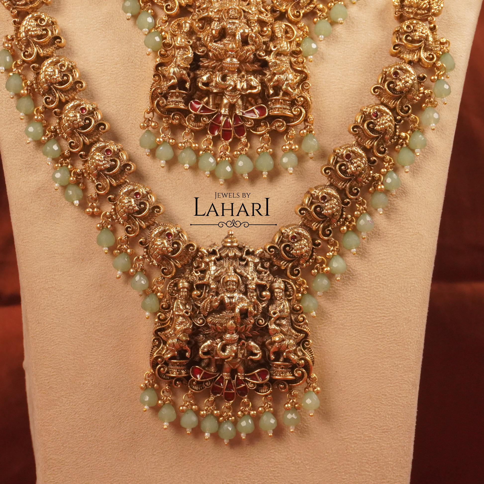 Celebrate tradition with timeless grandeur through this exquisite Lakshmi Vaibhav Haram Set. Designed with intricate temple-inspired craftsmanship, this combo features a beautifully detailed dual-layer haram adorned with divine Lakshmi motifs and complemented by elegant jhumka earrings.