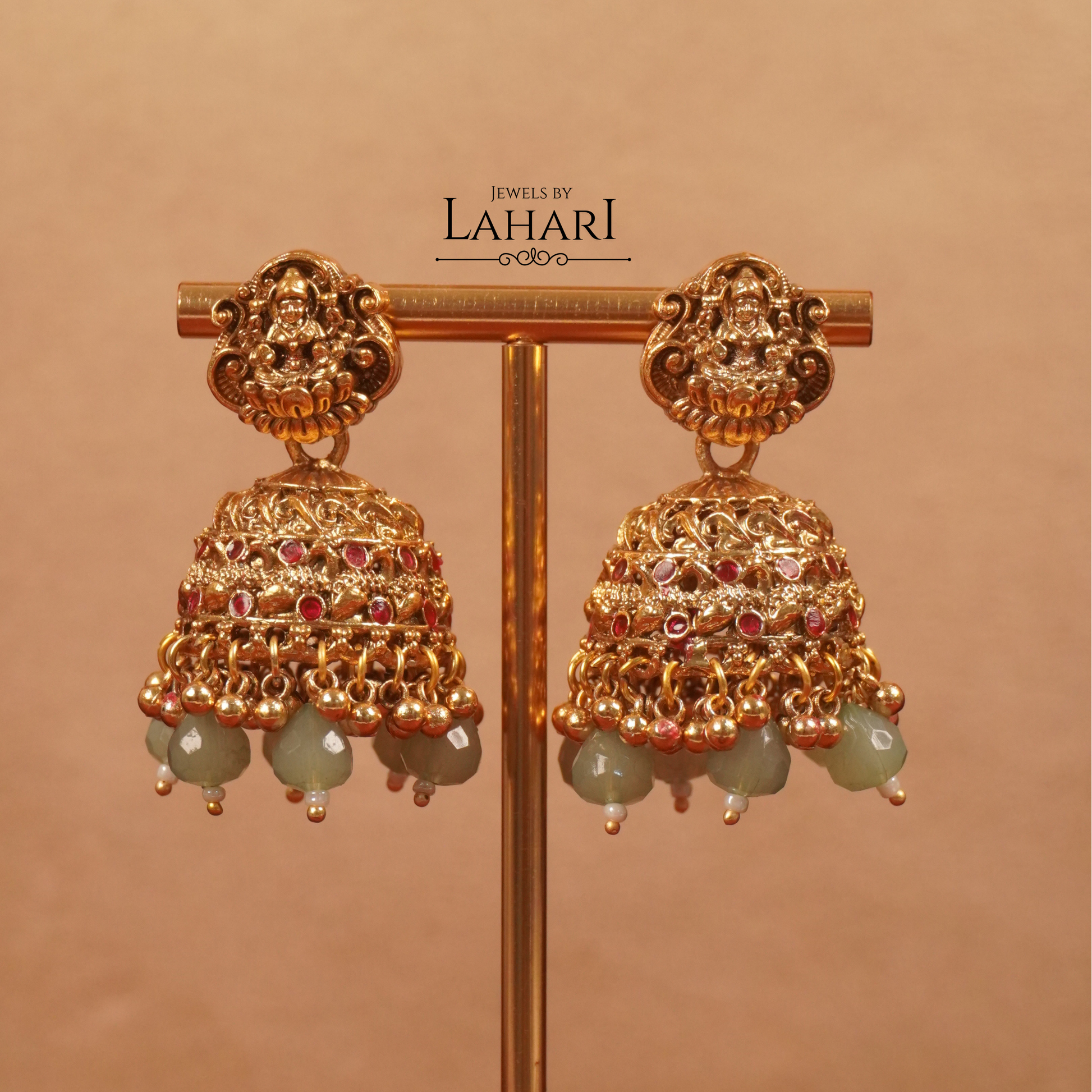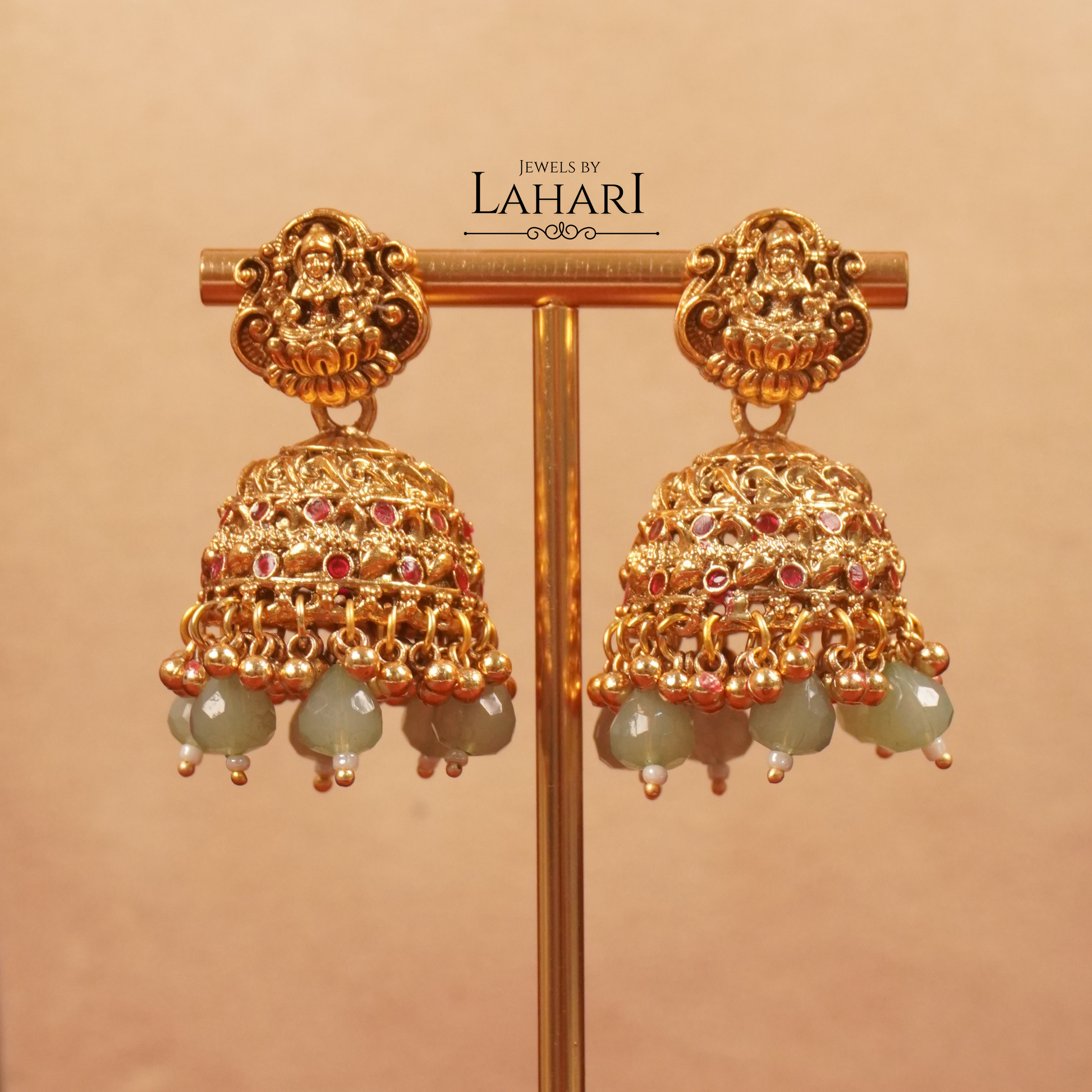 The antique gold finish, highlighted with subtle ruby accents and soft green bead drops, brings a perfect blend of richness and grace. The layered design adds depth and royal charm, making it an ideal choice for weddings, festive occasions, and bridal wear.