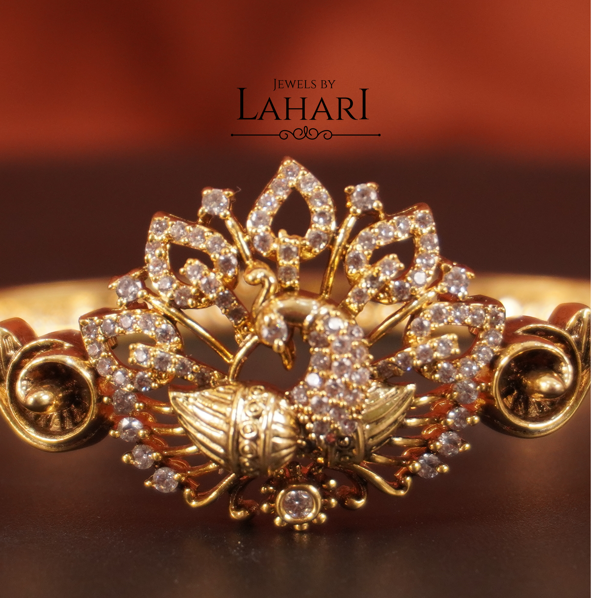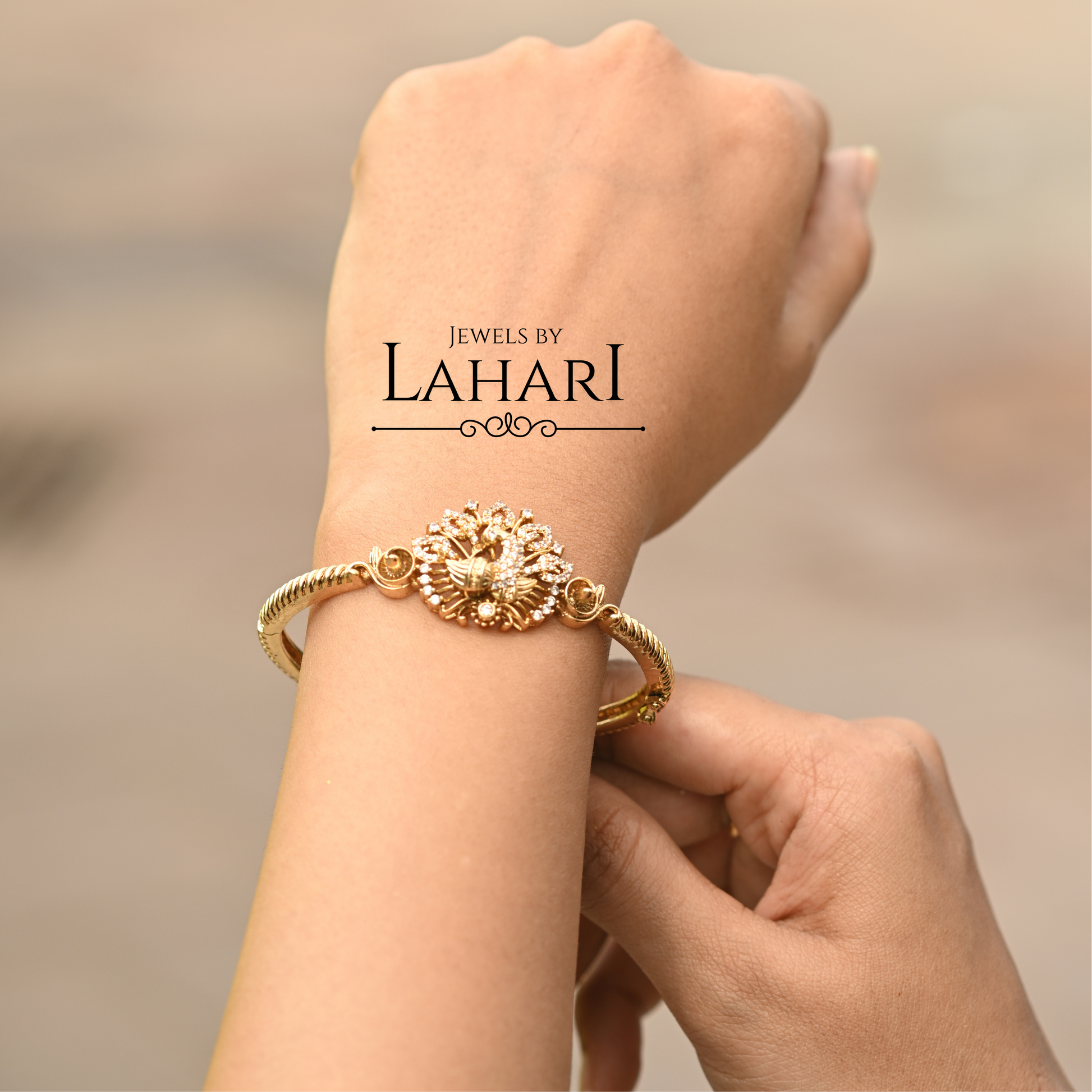 A symbol of grace and grandeur, the Pretty CZ Peacock Bracelet is designed to captivate. This intricately crafted openable kada features a majestic peacock motif embellished with dazzling CZ (cubic zirconia) stones. The twisted band detailing adds a modern touch to its traditional essence, making it a statement piece for festive occasions or elegant gatherings.