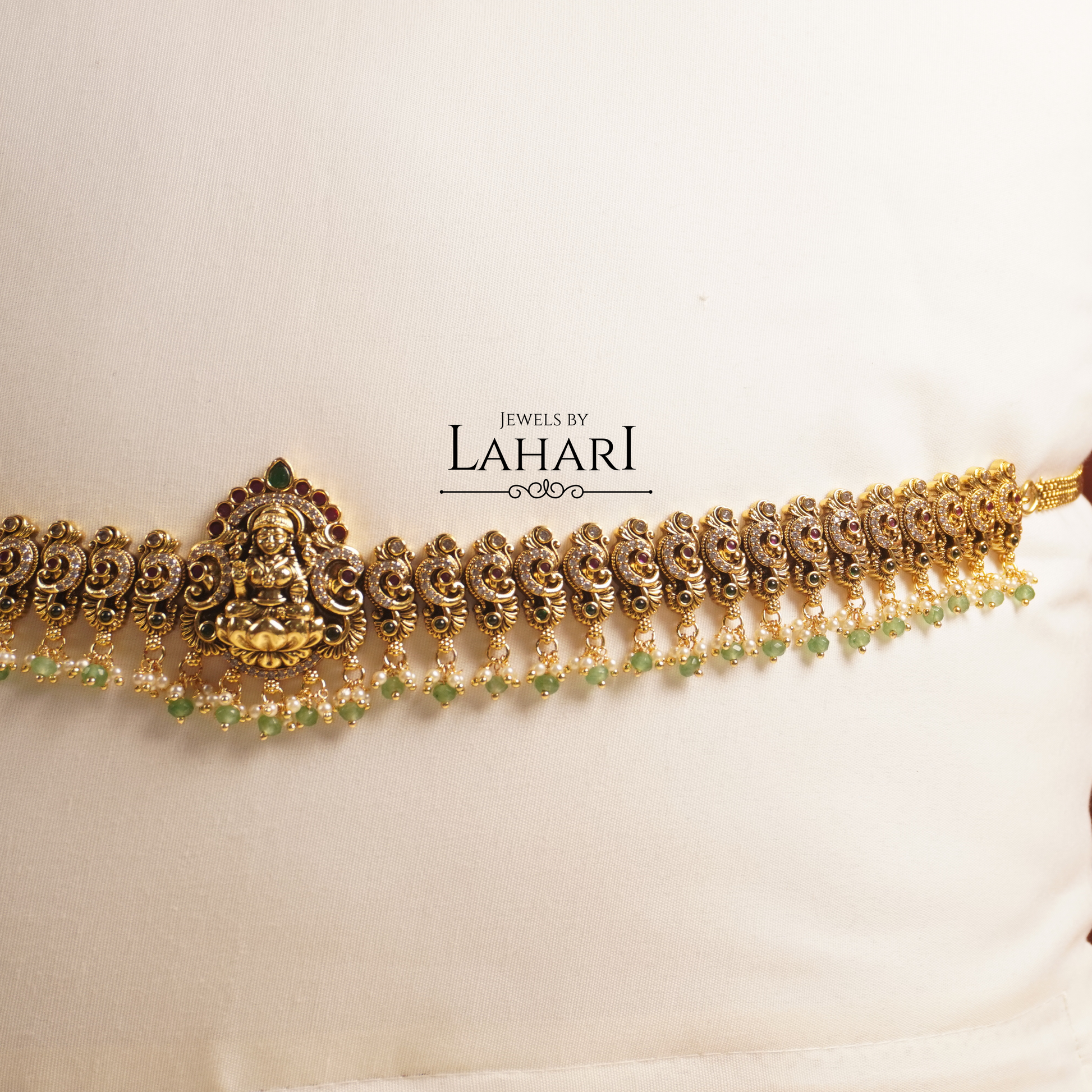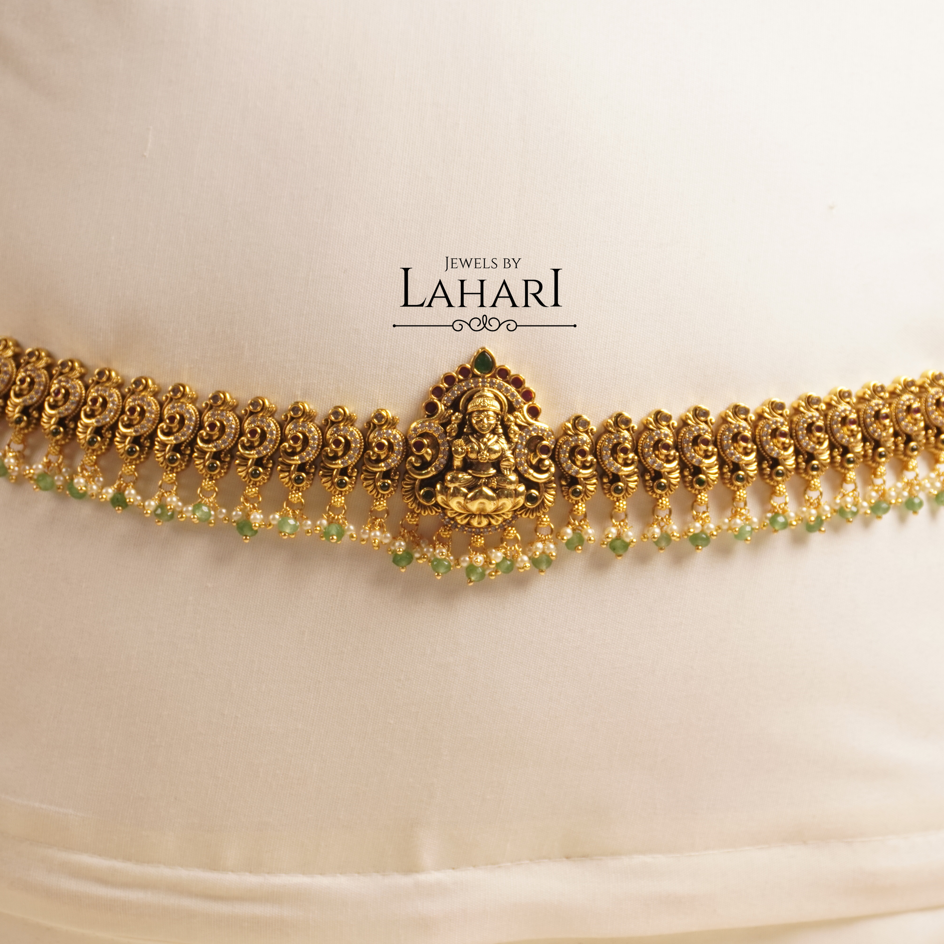Radiating divine opulence, the Suvarnalakshmi Vaddanam is a masterpiece of traditional craftsmanship. The centerpiece features Goddess Lakshmi seated gracefully, symbolizing prosperity and auspicious beginnings. Surrounded by intricate paisley motifs and embellished with green and gold-toned detailing, this hip belt exudes royal grandeur. Every bead and carving captures the essence of temple artistry — making it a treasure for bridal and festive ensembles.
